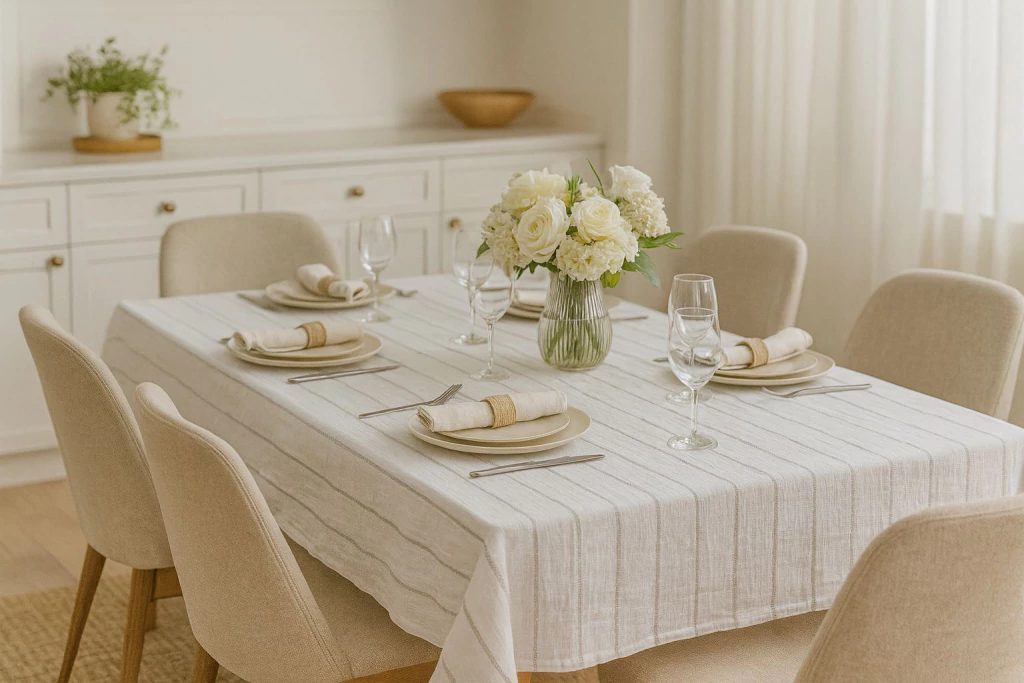 Nuestro Mantel de tusor, el aliado perfecto para estas fiestas. Su diseño clásico y textura suave realzan cualquier mesa, creando un ambiente cálido para compartir momentos especiales en familia.